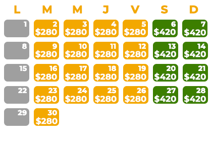Los días marcados en verde abre todo el parque con todas las atracciones.